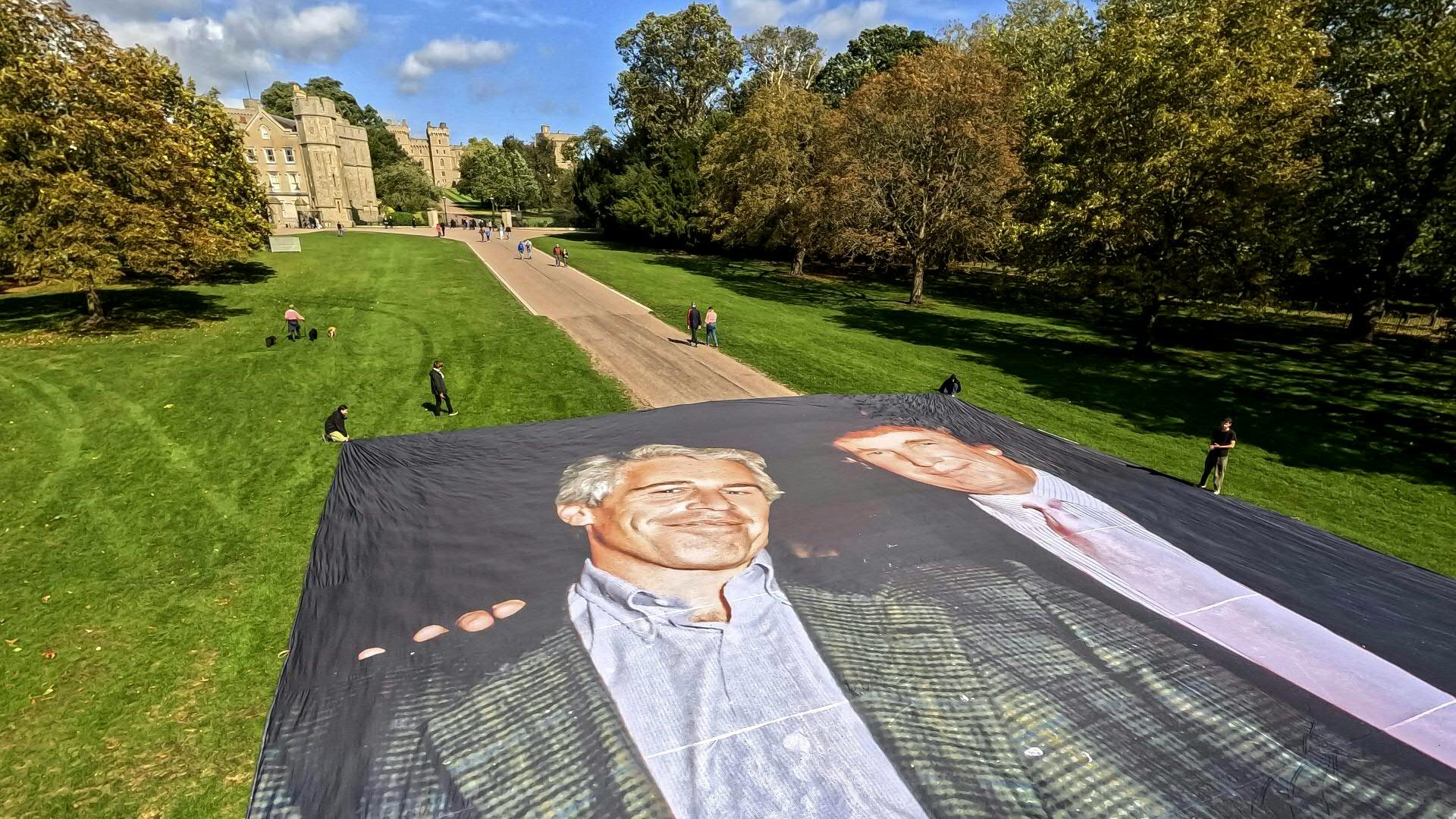 Kurz vor der Ankunft von Donald Trump in Großbritannien haben britische Aktivisten ein riesiges Foto mit dem US-Präsidenten und dem gestorbenen Sexualstraftäter Jeffrey Epstein nahe von Schloss Windsor ausgebreitet. Auch Fotos mit Trump und Epstein auf Tassen und ähnlichem sind im Umlauf.<br /><br />Credit: AFP<br /><br />Mehr zum Thema und die neuesten Updates auf https://www.derstandard.at.