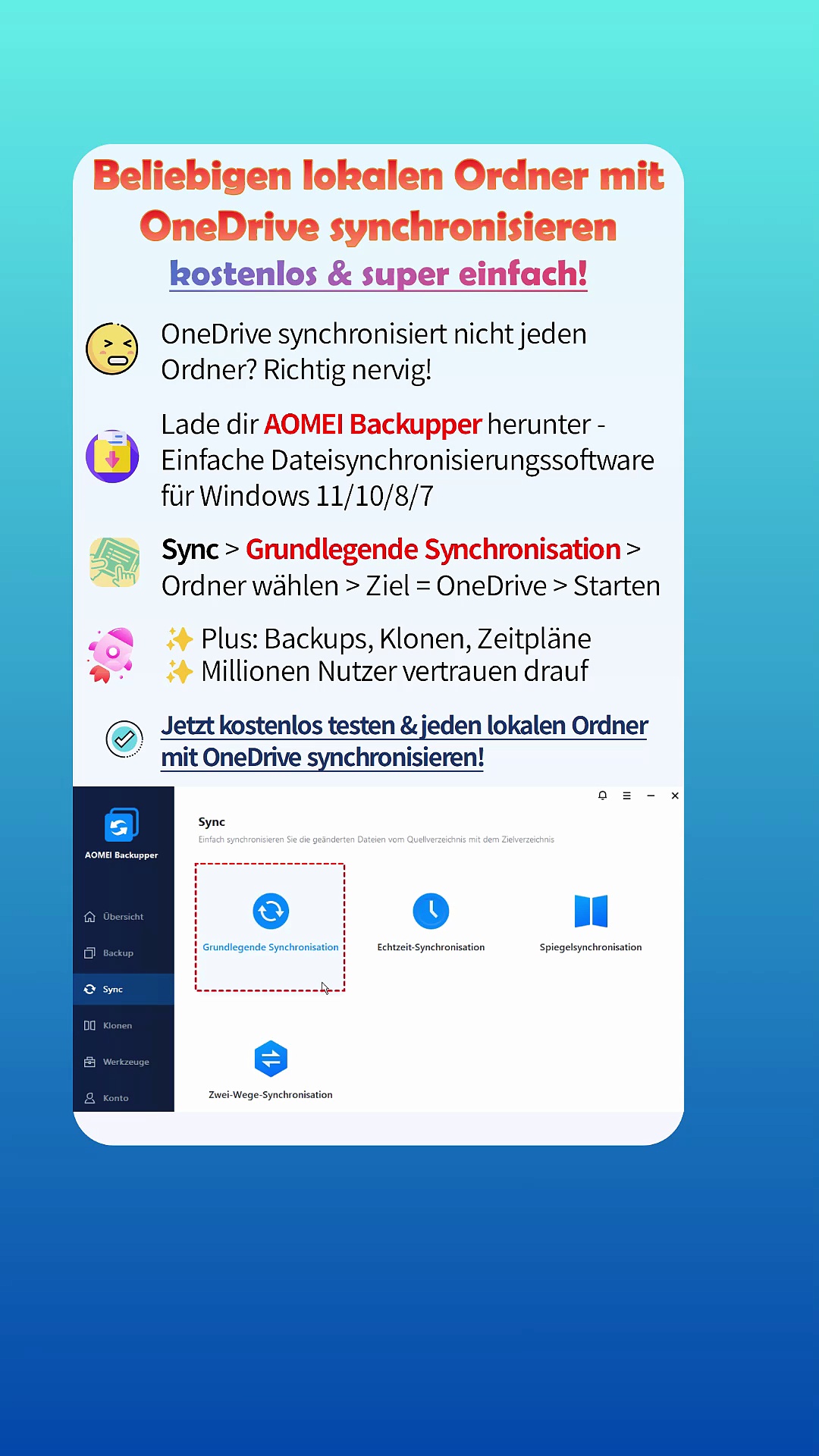 OneDrive synchronisiert nicht jeden Ordner? Richtig nervig! 😤 Mit AOMEI Backupper kannst du beliebige lokale Ordner mit OneDrive automatisch synchronisieren. Einfach öffnen, Sync starten und fertig! 🚀<br />Zusätzlich: Backups, Klonen, Zeitpläne – Millionen Nutzer vertrauen AOMEI Backupper. 🔒<br />#OneDrive #OneDriveSync #OneDriveAutomatischSynchronisieren #BeliebigenOrdnerMitOneDriveSynchronisieren #Backup #CloudSync #WindowsTools #AOMEI #Productivity #SoftwareTips