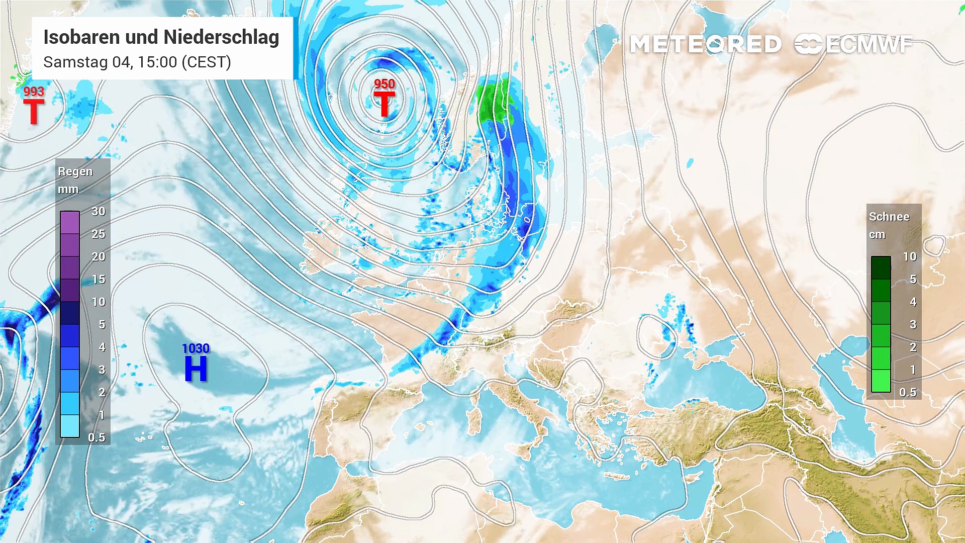 Frühlingserwachen dank Hoch Ingeborg in Deutschland und „Land unter“ auf der Iberischen Halbinsel aufgrund der Tiefdruckgebiete auf dem Atlantik.
