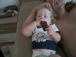 Sonntags Morgens - der Papa schläft noch - isst unser süßer Sohn eine Milchschnitte im Ehebett.
