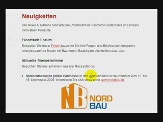 Neuigkeiten <br />Alle News & Termine rund um das Unternehmen Floortech Fundamente und unsere innovativen Produkte. <br />Floortech Forum <br />Besuchen Sie unser Forum tauschen Sie Ihre Fragen und Erfahrungen rund um's energiesparende Bauen mit Bauherren, Bauträgern, Architekten usw. aus. <br />Aktuelle Messetermine <br />Besuchen Sie uns auf einem unserer Messestände: <br />Norddeutschlands größte Baumesse in den Holstenhallen in Neumünster vom 10. bis 15. September 2009. Informieren Sie sich vorab unter www.nordbau.de <br /><br />Umweltmesse 2009 im Bremer Weserpark vom 14. bis 17. Oktober 2009. Detailinformationen erhalten Sie unter www.messe.ag
