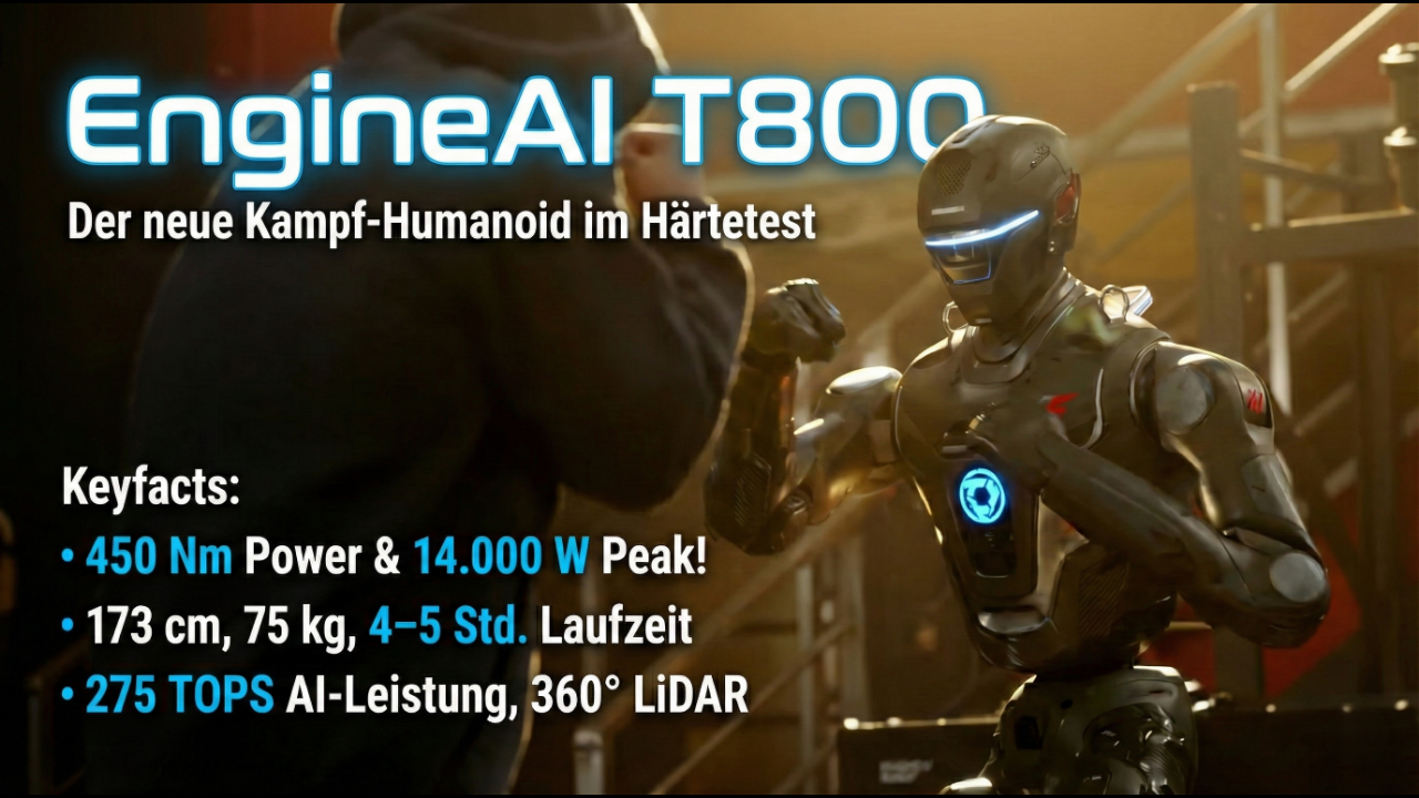 Der EngineAI T800 zeigt, wie weit moderne humanoide Robotik bereits gekommen ist und kombiniert extreme Beweglichkeit mit echter Industrie‑Power. In diesem Video seht ihr die wichtigsten Fakten, Highlights und Funktionen des beeindruckenden Full‑Size‑Humanoiden.<br /><br />😇 Dein Abo hilft uns: https://tublo.eu/abonnieren <br />✅ Source: EngineAI <br />➡️ Mehr Infos: https://www.tuningblog.eu/tipps_tuev-dekra-u-co/t800-von-engineai-761311/<br /><br />Der T800 wurde für reale Einsatzfelder entwickelt und überzeugt mit 173 cm Körpergröße, 75 kg Gewicht, modularer Solid‑State‑Batterie und einer Laufzeit von 4–5 Stunden dank aktivem Kühlungssystem. Seine Gelenkantriebe liefern bis zu 450 Nm und ermöglichen hochdynamische Bewegungen wie Flugtritte, Capoeira‑Rotationen und schnelle Richtungswechsel. <br /><br />Ausgestattet mit 360° LiDAR, Stereo‑Vision und millisekundenschneller Verarbeitung bewegt sich der Humanoid sicher durch komplexe Umgebungen. Das System basiert auf Intel N97 Computing und einem NVIDIA AGX Orin Modul mit 275 TOPS AI‑Leistung. Entwickelt für Logistik, Service, Forschung und robotische Kollaboration, setzt der T800 auf ein robustes, aerodynamisches Design mit Aluminium‑Außenhaut und 29 DOF plus 7 DOF pro Hand für präzise Manipulation.<br /><br />#EngineAIT800 #HumanoidRobot #Robotics #AI #RobotFighter #EngineAI #TechInnovation #FutureTech #tuningblog - das Magazin für Auto-Tuning und Mobilität!