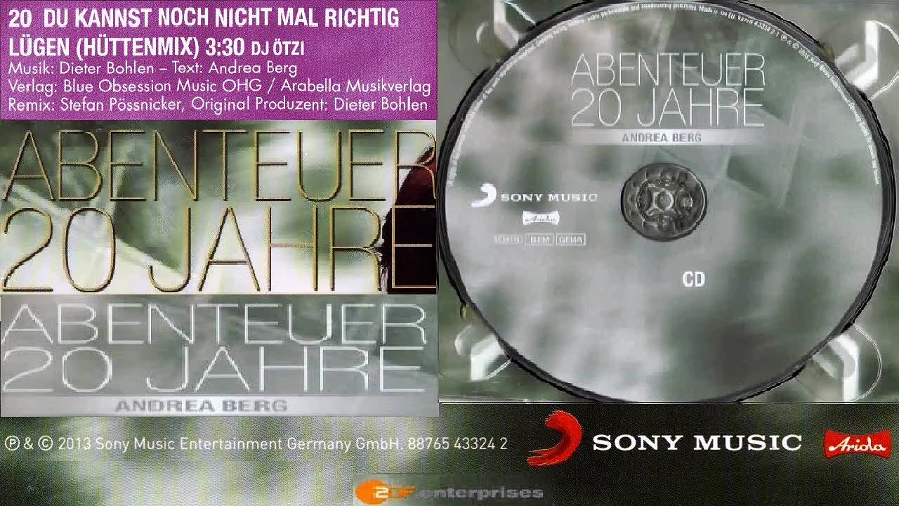 ANDREA BERG — DU KANNST NOCH NICHT MAL RICHTIG LÜGEN (HÜTTENMIX) 3:30 | Von ANDREA BERG – ABENTEUER 20 JAHRE · (2012) · CD <br /><br />Darsteller: Andrea Berg<br /><br />Teil: DU KANNST NOCH NICHT MAL RICHTIG LÜGEN (HÜTTENMIX)<br /><br />Musik: Dieter Bohlen<br />Text: Andrea Berg<br />Verlag: Blue Obsession Music OHG / Arabella Musikverlag<br />Remix: Stefan Pössnicker, Original Produzent: Dieter Bohlen<br /><br />CD: ANDREA BERG - ABENTEUER 20 JAHRE<br />von Andrea Berg<br />Erscheinungsdatum: 27. Januar 2012<br />℗ & © 2013 Sony Music Entertainment Germany GmbH. 88765 43324 2<br />SONY MUSIC<br />Ariola<br />LC 00116<br />BIEM<br />GEMA<br />2DF enterprises<br />Schauspieler: Andrea Berg<br />Lichtdesign Axel Rothenburg <br />Studio: Ariola (Sony Music)<br />Sound-Format: Dolby 2.0 / (Dolby Digital 5.1) <br />Bild-Format: 16:9 PAL<br />Dolby Digital 5.1 - dts 5.1 - PAL<br />Made in Germany<br />Mitwirkender: Andrea Berg<br />PRODUCTION: JAN MENDELIN<br />KAMERA: ATHANASIOS CHRYSANTHOPOULOS <br />TON: MAURICE CONRAD <br />SCHNETT: MENTAL WORKS FILMPRODUKTION GMBH <br />SONY MUSIC<br />Gesamtlaufzeit: 3:30