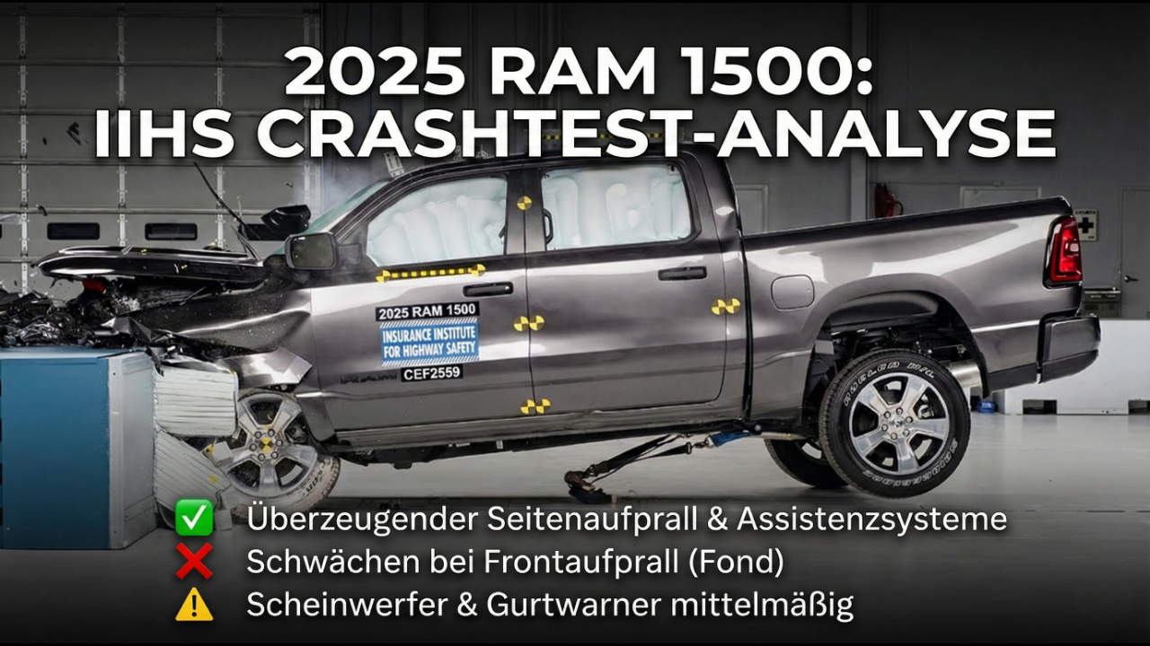 Der neue 2025 Ram 1500 Crew Cab wurde im IIHS Crashtest genau unter die Lupe genommen. In dieser Analyse zeigen wir euch, wie sich der Pickup in Front-, Seiten- und Sicherheitsbewertungen geschlagen hat.<br /><br />😇 Dein Abo hilft uns: https://tublo.eu/abonnieren <br />✅ Source: IIHS<br />➡️ Mehr Infos: https://www.tuningblog.eu/dies-u-das/ram-1500-iihs-crashtest-762765/<br /><br /> Der überarbeitete Ram 1500 punktet mit sehr guten Werten beim Seitenaufprall und starkem Fußgängerschutz. Beim moderaten Frontalcrash offenbaren sich Schwächen im Fondbereich, besonders bei Gurtführung und Rückhaltesystem. Die Scheinwerfer-Performance variiert je nach Ausstattung deutlich, und auch die Gurtwarner sowie LATCH-Verankerungen schneiden nur mittelmäßig ab. Dennoch bleibt der Ram 1500 ein robuster und gut ausgestatteter Pickup mit moderner Sicherheitstechnik.<br /><br />#Ram1500 #IIHSCrashtest #PickupTest #2025Ram<br />#Autosicherheit #Crashtest #RamPickup #Fahrbericht<br />#tuningblog - das Magazin für Auto-Tuning und Mobilität!