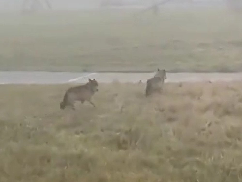 Zwei Wölfe streifen entspannt über Kinderspielplatz. Hubert Aiwanger warnt auf X: "Wölfe laufen über Spielplatz!" und antwortet auf Abschuss-Forderung mit: "Bin dabei."