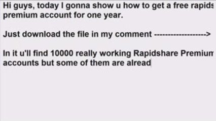 Here's the file: [URL="http://rapidshare.com/files/258391894/10000_RS_Premium_Acc_4_Free_-_May_2009.txt"]http://rapidshare.com[/URL]... it's really working but please DON'T CHANGE THE PASSWORDS and have fun with it.