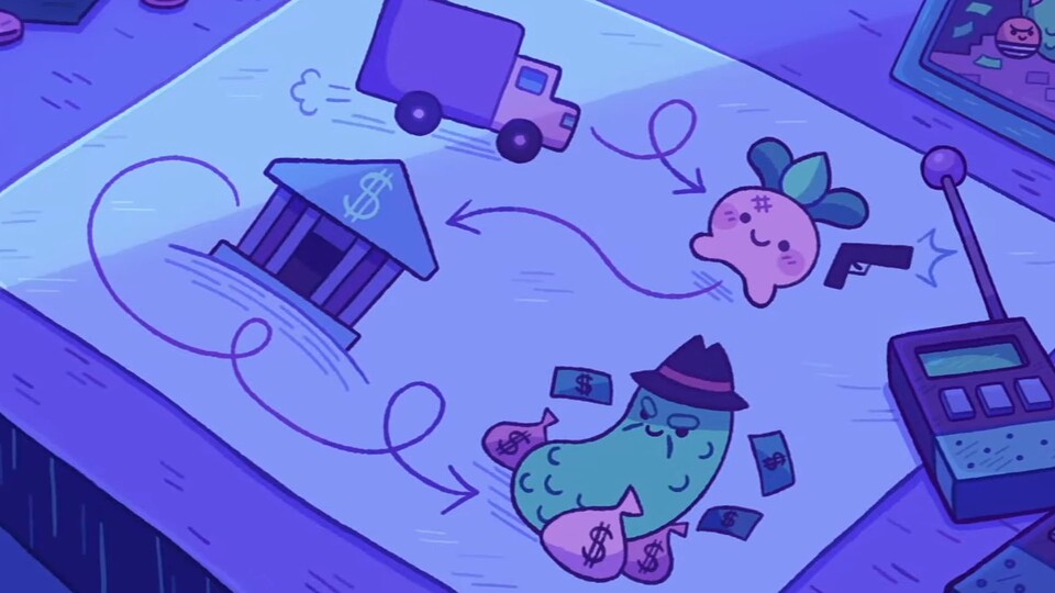 Turnip Bay Robs a Bank ist ein Bullet-Hell-Shoot mit Roguelite-Elementen, in dem ihr mit jedem Run mehr von einer Bank erkundet und neue Waffen und Gadgets kauft