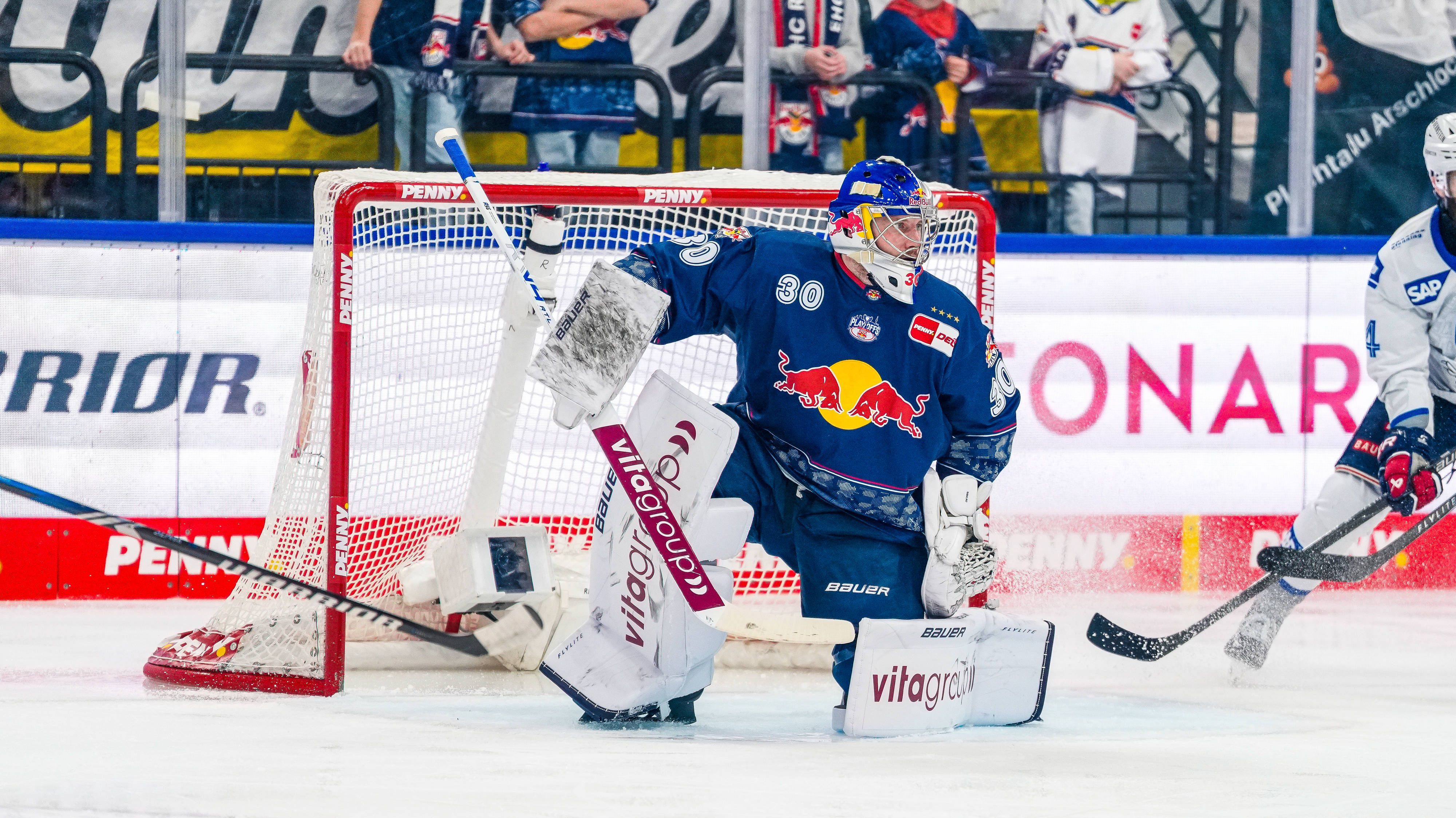 Hier gibt Highlights des Spiels EHC Red Bull München gegen Adler Mannheim (Play-offs 2026, 3. Spieltag).