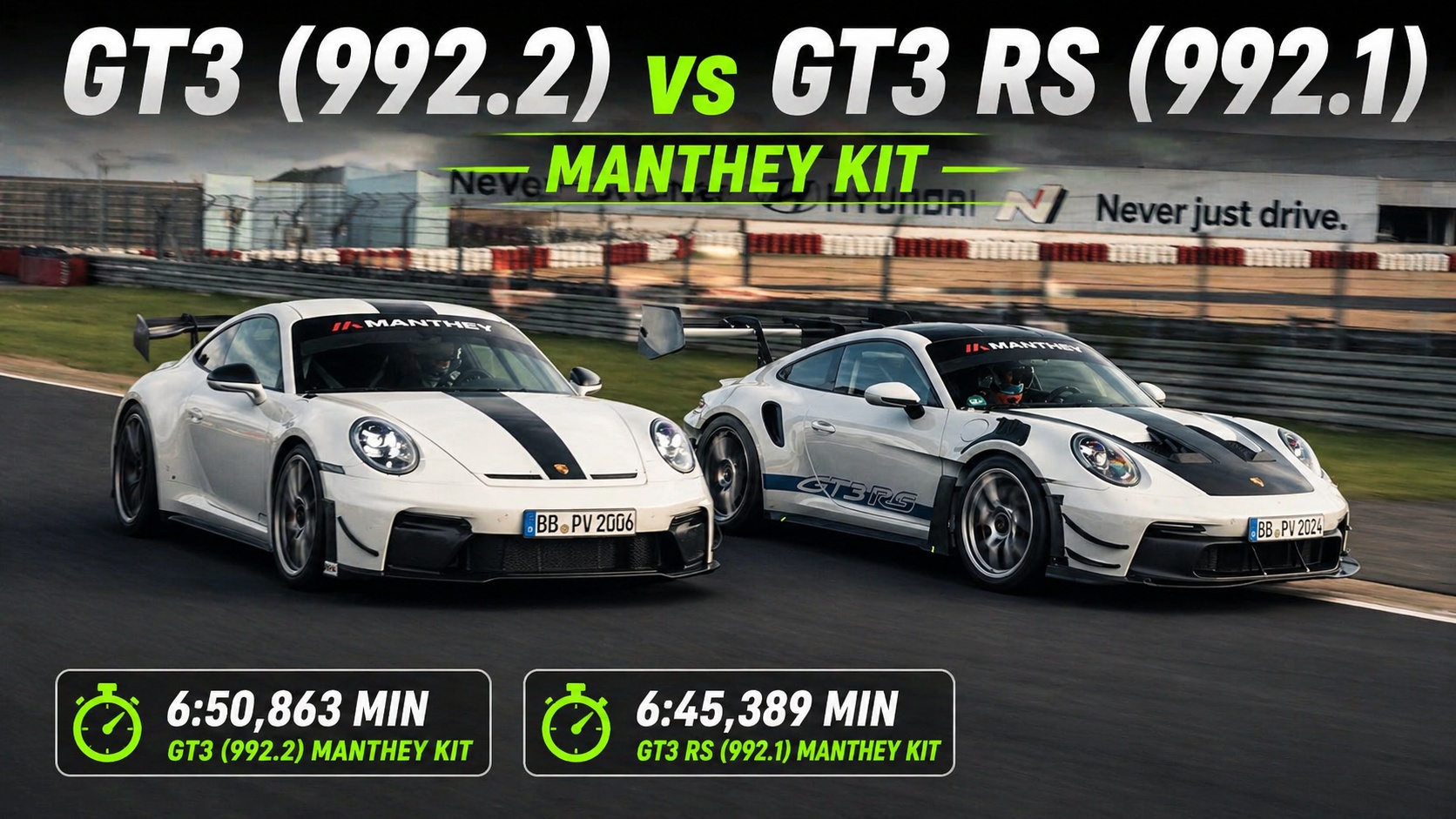 In diesem Video treten der Porsche 911 GT3 (992.2) mit Manthey Kit und der Porsche 911 GT3 RS (992.1) mit Manthey Kit im direkten Nordschleifen-Duell an. Beide Fahrzeuge zeigen ihre komplette Runde aus dem Cockpit – mit Zeiten von 6:50,863 min vs. 6:45,389 min.<br /><br />😇 Dein Abo hilft uns: https://tublo.eu/abonnieren <br />✅ Source: Porsche<br />➡️ Mehr Infos: https://www.tuningblog.eu/tipps_tuev-dekra-u-co/porsche-911-gt3-nordschleife-778570/<br />➡️ Mehr Infos: https://www.tuningblog.eu/tipps_tuev-dekra-u-co/porsche-911-gt3-rs-manthey-kit-776895/<br /><br />Die Onboard-Aufnahmen liefern einen direkten Vergleich zweier High-Performance-Setups auf der 20,832 km langen Nordschleife. Während Ayhancan Güven im GT3 (992.2) die Präzision und Balance des Manthey Kits demonstriert, zeigt Jörg Bergmeister im GT3 RS (992.1), wie extrem Aerodynamik und Abtrieb die Performance pushen. Über 1 t Downforce bei 285 km/h, ein semi-aktives Fahrwerk und optimierte Bremsen sorgen im RS für späteres Anbremsen und mehr Vollgasanteil. Beide Fahrzeuge sind mit Michelin Pilot Sport Cup 2 R Reifen unterwegs und wurden gemeinsam von Manthey Racing und Porsche entwickelt – mit dem Ziel, maximale Performance auf der Rennstrecke zu liefern, ohne die Straßenzulassung zu verlieren.<br /><br />#Porsche911GT3 #MantheyKit #Nordschleife #Onboard #GT3RS #Nürburgring #Trackday #Porsche #tuningblog - das Magazin für Auto-Tuning und Mobilität!