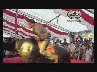 Das Video ist eine ungeschnittene Originalaufnahme vom Bullridingcontest zum<br />Countryfest in Kirchenlamitz am 05.07.2008. Bullridinggerät Black-Devil der<br />Firma Cowboyhat. Markenreitgerät Germanbull. Buchung unter www.cowboyhat.de.