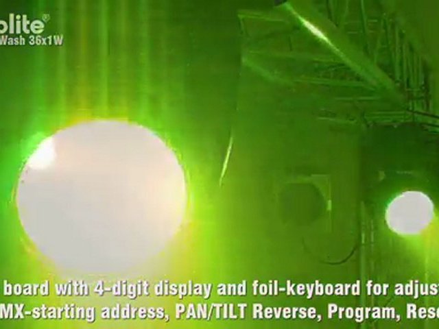 LED Moving-Head Washlight Kompaktes Leichtgewicht Bestückung mit 36 x 1 Watt LEDs: 12 x rot,12 x grün,12 x blau Positionierung innerhalb 540° PAN und 255° TILT Stufenlose RGB Farbmischung Vorprogrammierte Szenen im Program Run für Standalone-Betr
