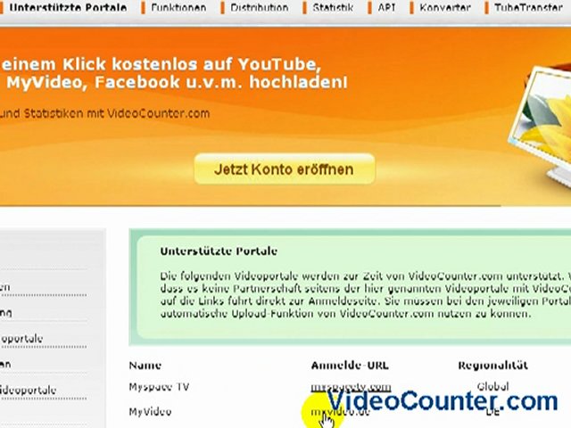 http://www.VideoCounter.com ist das universelle Werkzeug für Ihr Videomarketing. Steigern Sie die Reichweite Ihrer Bewegtbild-Kommunikation mit einem Klick: 1 Upload auf VideoCounter.com bringt Sie auf derzeit bis zu 20 Videoportale und Social Communities wie YouTube, Sevenload, Clipfish und Facebook. VideoCounter.com: Mehr Reichweite. Weniger Aufwand. Mehr Transparenz. Weitere Funktionen: Mit der automatischen Videodistribution (Videos hochladen) über unsere Upload-Schnittstelle konzentrieren Sie sich ganz auf Ihr Videomarketing, ohne Zeit mit manuellen Uploads zu verlieren ( http://www.videocounter.com/pages/api.php ). Mit dem integrierten Statistikmodul können Sie den Erfolg Ihrer Videos auf Videoportalen mit wichtigen Kenngrößen wie Videos-Views, Anzahl der Kommentare u. a. zentral erfassen, statistisch auswerten und exportieren ( http://www.videocounter.com/pages/statistik.php ). Mi
