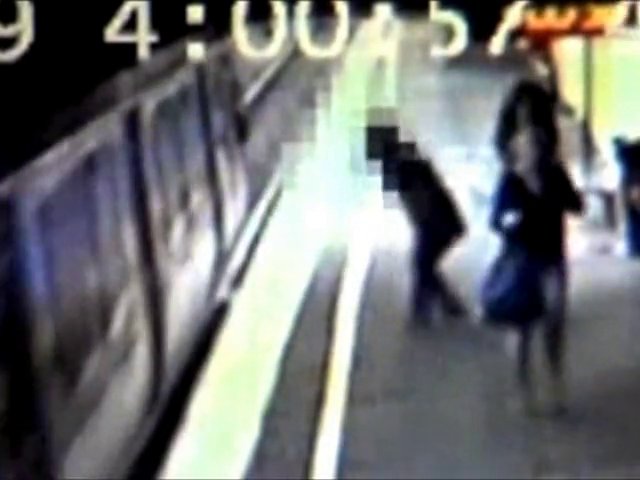 Ein Kinderwagen rollt vor einen einfahrenden Zug - aber das Baby kommt wie durch ein Wunder mit einer leichten Schramme davon.<br /> Ref: SPL133303 161009 <br /> Video by: Splash News