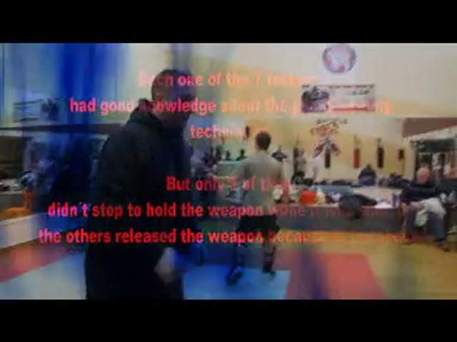 There are two important things: <br />1. The most dangerous thing is the bullet, that´s why you must go immediately out of the line of fire and stay there at any price. <br />2. Control the weapon fastest possible and don´t lose this control. <br /><br />The aspirants had to show the gun defence techniques they learned before. What they didn´t know was that at some point there was a gun with a blank cartridge in play. The exercise was to keep the weapon under control at any price and not to release the weapon even if they are frightened in case that the attacker fires a shot. <br />Each one of the 7 testees had good knowledge about the gun disarming <br />techniques. <br />But only 3 of them didn´t stop to hold the weapon while it was shot, all <br />the others released the weapon because of the shock. <br />Please note: <br />In reality there will nobody attack you with a rubbergun. <br />Krav Maga Street Defence <br />http://www.krav-maga-essen.de