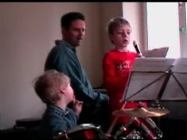 Emil Johannes Himmerich (Schlagzeug), Samuel Benedikt Himmerich (Flöte) und Hubertus Himmerich (E-Klavier) spielen das beliebte Kinderlied "Alle meine Entchen".