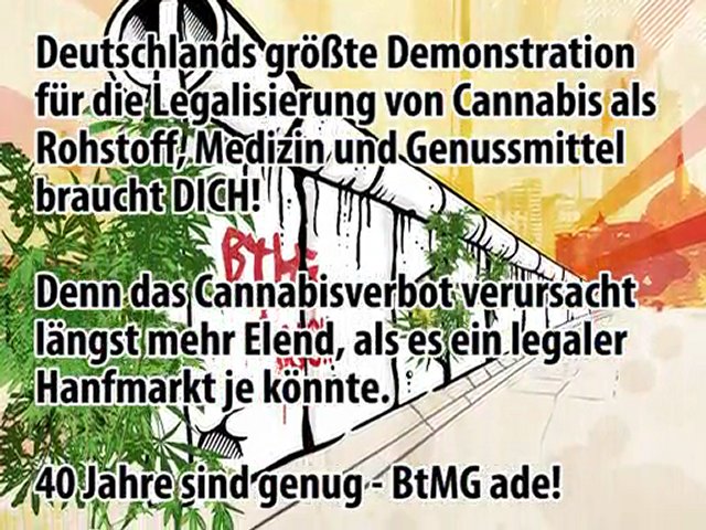 Kleines Werbevideo für die Hanfparade 2011, bei der am 06.August unter dem Motto "40 Jahre sind genug - BtMG ade!" in Berlin für die Legalisierung von Cannabis als Rohstoff, Medizin und Genussmittel demonstriert wird.<br /><br />Mehr auf http://www.hanfparade.de/<br /><br />Das ist die 2. Version des Clips. Feedback, Kritik und Anregungen sind höchst willkommen.<br /><br />Ton: Film "Boondock Saints 2"<br />Idee und Produktion: Steffen Geyer http://usualredant.de/