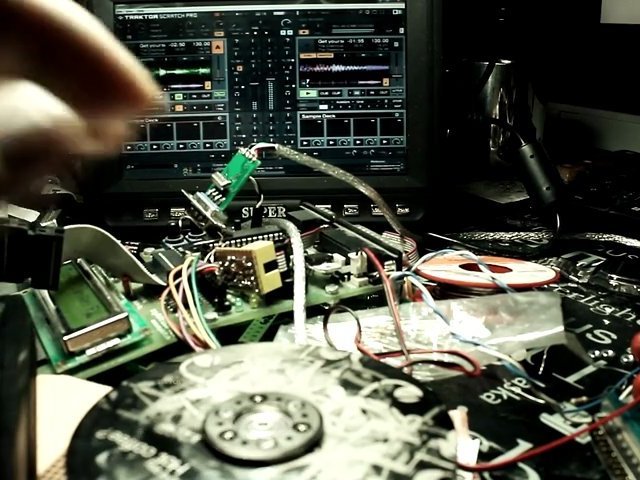 Harddisc Rotary Encoder ia Atmega8 and Serial2Midi.<br /><br />The Rotary Encoder is used to generate midi-sentences via an Atmega8 to finally interact with Traktor.