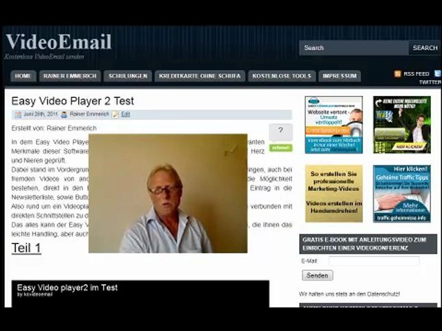 http://www.die-videoemail.info/empfehlungen/easy-video-player2-1 Der Test ist von bekannten Internetmarketern durchgeführt worden. <br />Dabei stand im Vordergrund, den eigenen Content mit in dem Videoplayer einzubringen, auch bei fremden Videos von anderen Videoplattformen. Zum anderen sollte auch die Möglichkeit bestehen, direkt in den Bildschirm ein Bezahlbutton, die E-Mailadresse zum Eintrag in die Newsletterliste, sowie Buttons zu Facebook, Twitter und Digg mit einzubetten.