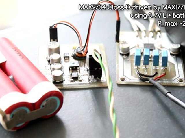 MAX9704 Class-D driven by MAX1771 Step-Up<br />using 3.7V Li+ Battery-Pack<br />Pmax ~2x8W RMS<br /><br />Current-limit at Boost-Inductor ~2.7A@300kHz
