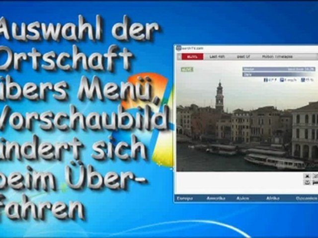 Installiere das EarthTV-Gadget von CheZoom.eu und sage uns Deine Meinung.<br /><br />EarthTV zeigt stündlich aktualisierte Videoclips aus 70 verschiedenen Reisezielen weltweit, inklusive aktueller Wetterdaten.<br /><br />EarthTV wird von Fernsehstationen in der ganzen Welt ausgestrahlt und earthTV Web-Programme werden von mehr als einhundert Reise-, Nachrichten- und Wetter-Webseiten gezeigt.<br /><br />The World Live wird fast stündlich von mehr als 5 Millionen Fernsehzuschauern in der ganzen Welt gesehen und zeigt 7 Reiseziele weltweit in 90 Sekunden, inklusive lokalen Wetterdaten.<br /><br />"The 3-Day Weather Forecast" benutzt Wettervorhersagen und archivierte Videos um die Wetterbedingungen vor Ort über die kommenden 3 Tage zu zeigen.<br /><br />besuche uns auf http://www.CheZoom.eu