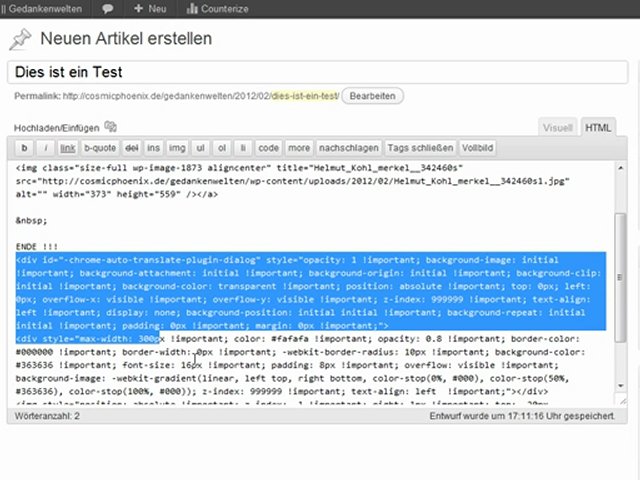 Mir ist neulich etwas interessantes aufgefallen das für Wordpress Blogbetreiber welche Chrome als Browser nutzen sicherlich ein sachdienlicher Hinweis sein kann. Und zwar fiel mir auf, das wenn ich den Google Chrome Browser benutze (und zwar ausschließlich hiermit!!) sich ungefragter Weise ein Code in meinen Wordpress Blog frisst ohne das ich hierfür jegliche Zustimmung erteilt hätte. <br />Ich habe auch keine Google Addons installiert bis auf den empfehlen Button, welcher hiermit aber nichts zu tun hat, da dies sonst in anderen Browsern der gleiche Fall sein müsste, wie im Chrome Browser. Ist es aber nicht. Mit anderen Browsern passiert mir das nicht, ausschließlich mit diesem Browser von Google. <br /><br />Dies scheint mir ein LIVE Spionagetool der Geheimdienste oder ähnlichem zu sein!! <br />Dieses Video beweist es... <br /><br />Seht bei euch iim Blog doch bitte einmal selbst nach. Denn bestellt, habe ich diesen Code nicht. <br />Und niemand hat meine Zustimmung erhalten, diesen Code in meinen Blog einzufügen!