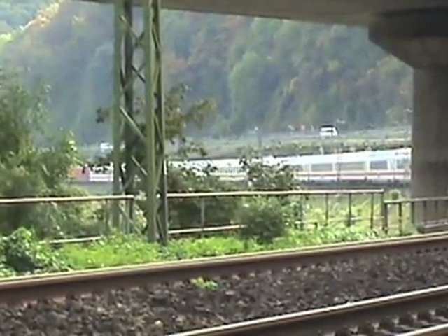 Gefilmt am 10.10.09 beim Unkelbachtal gegenüber des Örtchens Unkel am Rhein.<br />Der Zug hat Remagen gerade verlassen und wird gleich Oberwinter durchqueren.<br /><br />Filmed at the Unkel River Valley oposite the litte town of Unkel at the river Rhine.<br />The train just left Remagen and will pass by Oberwinter in a few minutes.<br />I found out that from the Unkelbach Valley behind me came once a little narrow gauge basalt steam railway down from the village Unkelbach. It was called the "Unkelbacher Basaltbähnchen". It carried basalt from the Eifel volcano area down to the river Rhine and to the ships which were waiting there. There was an extra tunnel below the standard gauge tracks for this railway. The tunnel and the railway disappeared in the middle of the 1950´s when the B9 street was transfered up this concrete bridge in the video.