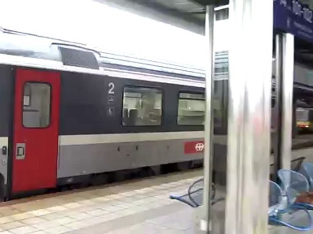 Irgendwo ein großer Bahnhof in einer europäischen Großstadt. Ein Reisezug - genauer: ein EC (EuroCity) der Schweizerischen Bundesbahnen - fährt gerade in den Bahnhof ein. Er hält hier. Auf dem Bahnsteig sind nur wenige Fahrgäste. Die Fahrgäste steigen aus und ein. Nach kurzem Aufenthalt fährt der Zug weiter. Er fährt seinem Reiseziel entgegen. <br />Viele Reisende ziehen heute die Bahn dem Auto vor, weil das Reisen mit der Bahn ruhiger, angenehmer und stressfreier ist. Wir wünschen den Reisenden eine angenehme Fahrt.<br />Bei diesem Bahnhof handelt es sich vermutlich um einen bundesdeutschen Bahnhof, denn dieser SBB EC wir von einer E-120 Lok der DB (Deutsche Bahn AG) gezogen. Diese Lok wirbt auch für 175 Jahre Bahn.