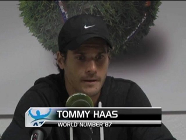 Tommy Haas stellt sich vor seinem Spiel beim ATP-Rasenturnier in Halle den Fragen der Journalisten.