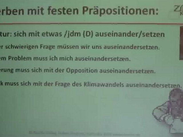 Wir lernen hier wichtige Verben mit festen Präpositionen. Bitte lernen Sie die genaue Struktur des Verbs und merken Sie sich am besten ein Beispiel:<br />In dieser Sache musst du dich mit ihm auseinandersetzen.