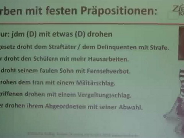 Wir lernen hier wichtige Verben mit festen Präpositionen. Bitte lernen Sie die genaue Struktur des Verbs und merken Sie sich am besten ein Beispiel:<br />Der Vater drohte seinem Sohn mit Strafe.
