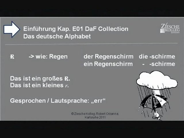 Das deutsche Alphabet: Wir lernen den Konsonanten R. R wie Regen. Wir sprechen err. Es regnet. Ich brauche einen Regenschirm.