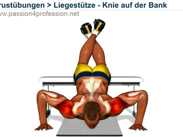 Liegestütze - Knie auf der Bank ist eine Übung für Brust, die auf die folgenden Bereiche: Brust, obere, die Vorderseite des Deltoideus und Trizeps-Muskeln funktioniert.<br />Begleiten Sie uns!<br />P4P Deutschland - http://www.dailymotion.com/P4PDeutsch<br />Facebook: http://www.facebook.com/pages/Passion4Profession-Inc/123267949096<br />Twitter: https://twitter.com/#!/P4P_Inc !<br /><br />P4P Official: http://www.passion4profession.net/de/