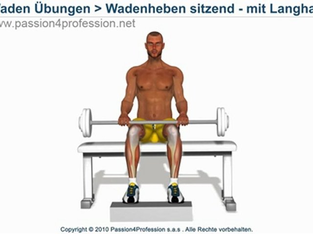 „Wadenheben sitzend - mit Langhantel" ist eine Variante der klassischen Übung „Wadengerät sitzend".<br />Begleiten Sie uns!<br />P4P Deutschland - http://www.dailymotion.com/P4PDeutsch<br />Facebook: http://www.facebook.com/pages/Passion4Profession-Inc/123267949096<br />Twitter: https://twitter.com/#!/P4P_Inc !<br /><br />P4P Official: http://www.passion4profession.net/de/