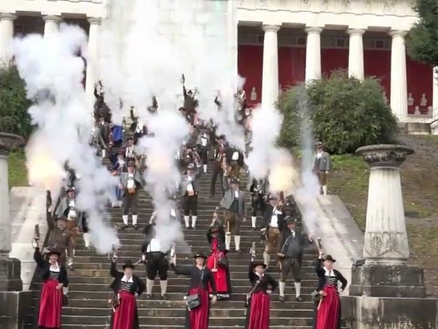 Oktoberfest 2013: Böllerschießen vor der Bavaria am 7.10.2023. Anlässlich der Siegerehrung des Oktoberfest-Landesschießen "Bayerischer Sportschützenbund" schießen Böllerschützen des Münchner Böllerregiment einen großen Salut auf den Stufen zur Bavaria. http://www.ganz-muenchen.de/oktoberfest/themen/boellerschiessen/vor_der_bavaria.html
