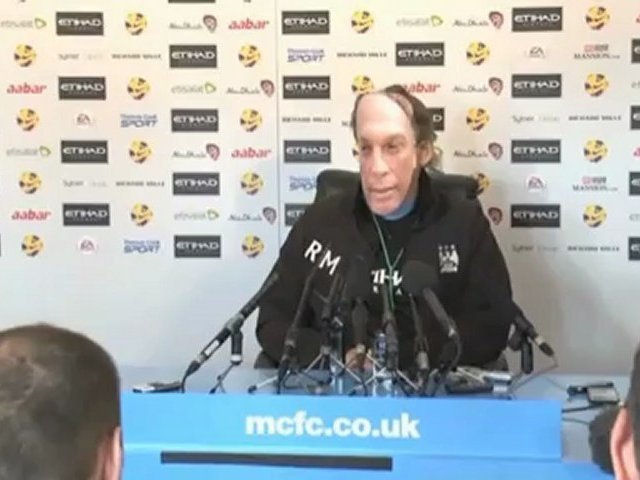Er hatte die Fragen der Journalisten und die Pressekonferenz leid. Daher kam der Trainer von Manchester City Roberto Mancini kurzerhand mit einer Maske seines Co-Trainers David Platt, weil er diesen zuletzt immer vorschickte.