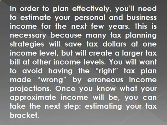 BP Holdings Management<br /><br />Countless tax planning strategies are available to small business owners. Some are aimed at the owner’s individual tax situation and some at the business itself, but regardless of how simple or how complex a tax strategy is, it will be based on structuring the strategy to accomplish one or more of these often overlapping goals:<br /><br />• Reducing the amount of taxable income<br />• Lowering your tax rate<br />• Controlling the time when the tax must be paid<br />• Claiming any available tax credits<br />• Controlling the effects of the Alternative Minimum Tax<br />• Avoiding the most common tax planning mistakes<br /><br />In order to plan effectively, you’ll need to estimate your personal and business income for the next few years. This is necessary because many tax planning strategies will save tax dollars at one income level, but will create a larger tax bill at other income levels. You will want to avoid having the “right” tax plan made “wrong” by erroneous income projections. Once you know what your approximate income will be, you can take the next step: estimating your tax bracket.<br />The effort to come up with crystal-ball estimates may be difficult and by its very nature will be inexact. On the other hand, you should already be projecting your sales revenues, income, and cash flow for general business planning purposes. The better your estimates are, the better the odds that your tax planning efforts will succeed.<br />Bp holdings management<br />Related Videos:<br />http://current.com/groups/bp-holdings-management-main/<br />http://www.goodreads.com/group/show/84535-bp-holdings-management<br />http://www.dailymotion.com/video/xv898w_bp-holdings-management_news#.UKtGA4fqlaw<br />http://www.myvideo.de/watch/8858462/BP_Holdings_Management