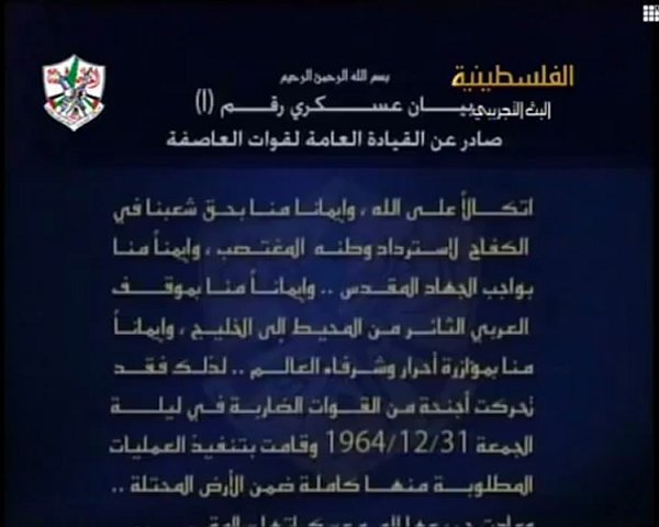 بسم الله الرحمن الرحيم<br /><br />"البيان الأول لقوات العاصفة<br />حركة التحرير الوطني الفلسطيني<br />" فتــــــــح "<br />بلاغ عسكري رقم ( 1 )<br /><br />صادر عن القيادة العامة لقوات العاصفة<br /><br />اتكالا منا على الله ، وإيمانا منا بحق شعبنا في الكفاح لاسترداد وطنه المغتصب ، وإيمانا منا بواجب الجهاد المقدس .. وإيمانا منا بموقف العربي الثائر من المحيط إلى الخليج وإيمانا منا بمؤازرة أحرار وشرفاء العالم ..لذلك فقد تحركت أجنحة من القوات الضاربة في ليلة الجمعة 31/12/1964 م وقامت بتنفيذ العمليات المطلوبة منها كاملة ضمن الأرض المحتلة .. وعادت جميعها إلى معسكراتها سالمة ... وإننا لنحذر العدو من القيام بأية إجراءات ضد المدنيين الآمنين العرب أينما كانوا ... لان قواتنا سترد على الاعتداءات ممثلة .. وسنعتبر هذه الإجراءات من جرائم الحرب .. كما وأننا نحذر جميع الدول من التدخل لصالح العدو بأي شكل كان .. لان قواتنا سترد على هذا العمل بتعريض مصالح الدول للدمار أينما كانت ..<br /><br />عاشت وحدة شعبنا وعاش نضاله لاستعادة كرامته ووطنه<br /><br />القيادة العامة لقوات العاصفة<br />التاريخ 1/1/1965م