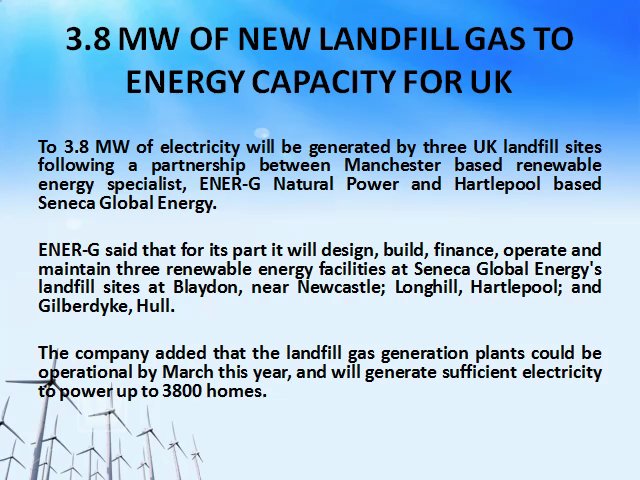 3.8 MW OF NEW LANDFILL GAS TO ENERGY CAPACITY FOR UK<br />Asia Global Energy<br />Up to 3.8 MW of electricity will be generated by three UK landfill sites following a partnership between Manchester based renewable energy specialist, ENER-G Natural Power and Hartlepool based Seneca Global Energy.<br />ENER-G said that for its part it will design, build, finance, operate and maintain three renewable energy facilities at Seneca Global Energy's landfill sites at Blaydon, near Newcastle; Longhill, Hartlepool; and Gilberdyke, Hull.<br />The company added that the landfill gas generation plants could be operational by March this year, and will generate sufficient electricity to power up to 3800 homes.<br />Combined the plants are expected to cut annual carbon dioxide equivalent from the sites by a total of 117,264 tonnes, offering a comparable benefit to the carbon sequestered annually by 96,118 acres of pine forest.<br />According to ENER-G methane gas will be drawn from the sites using a series of wells and then converted into electricity using ENER-G landfill gas generation equipment, designed and manufactured at the company's global headquarters in Salford, Greater Manchester.<br />The company added that the generating equipment will be housed in small soundproofed enclosures.<br />The projects will be funded by ENER-G, including operation and maintenance.<br />Over the past decade the company said that it has designed, built and safely operated more than 100 landfill gas facilities, providing in excess of 160 MW of generation capacity.<br />Asia Global Energy